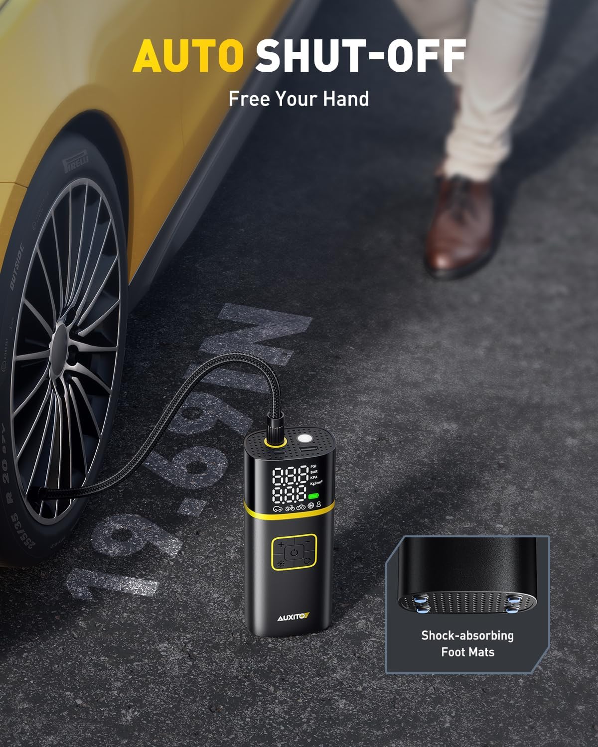 【Dual Screen Display for Precision & Clarity】 AUXITO portable air compressor for car tires featuring a dual-screen design, this portable air compressor displays both real-time pressure and preset values with ±1 PSI accuracy. The upgraded, larger screens are sunlight-readable, ensuring clear visibility even in bright outdoor conditions