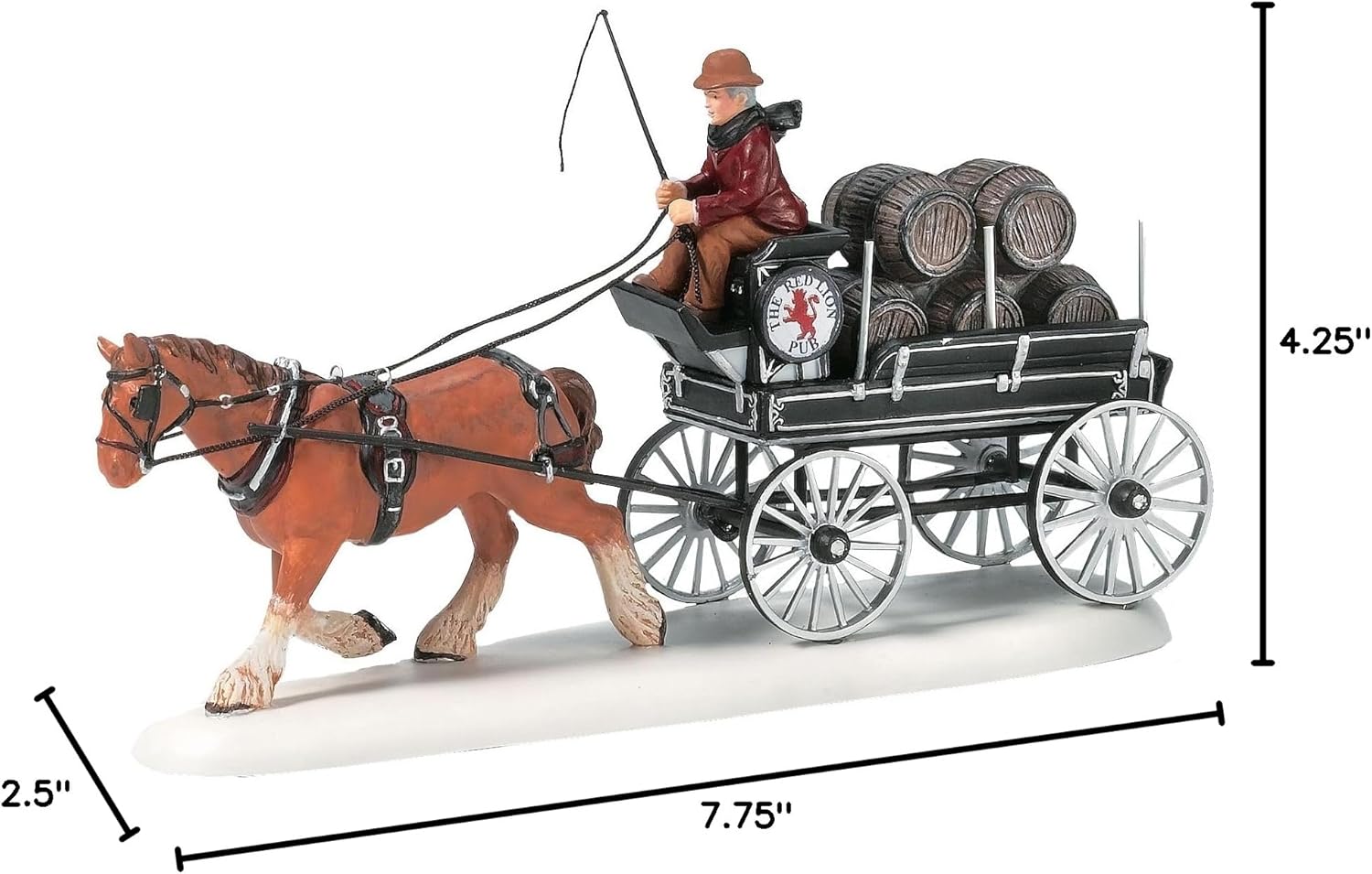 DESIGN: features a horse-drawn buggy loaded with a driver and beer kegs, made for display in your mini decorative Dickens’ Village!