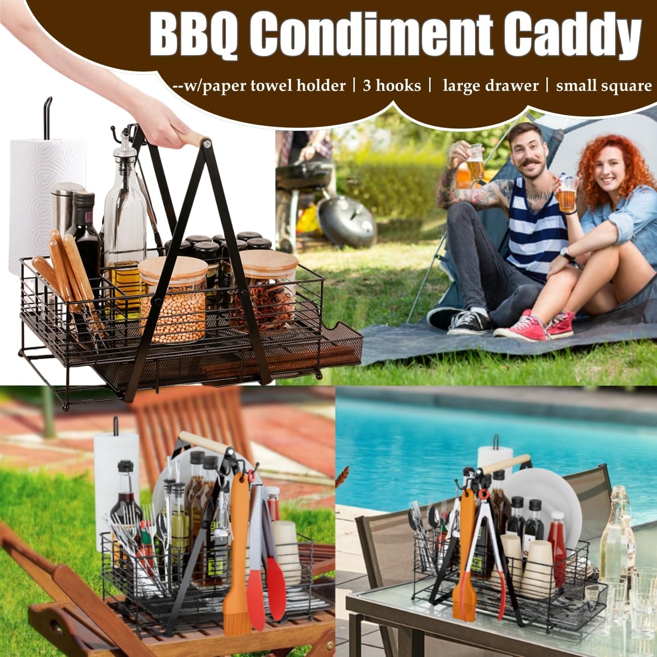 Enough Space: Barbecue caddy has 6 compartments with wooden handles designed for easy carrying, plus a paper towel roll holder and 3 hooks, large enough storage space for you to store all kinds of barbecue accessories, camping tools, condiments, grilling tools, spoons, cups and more.