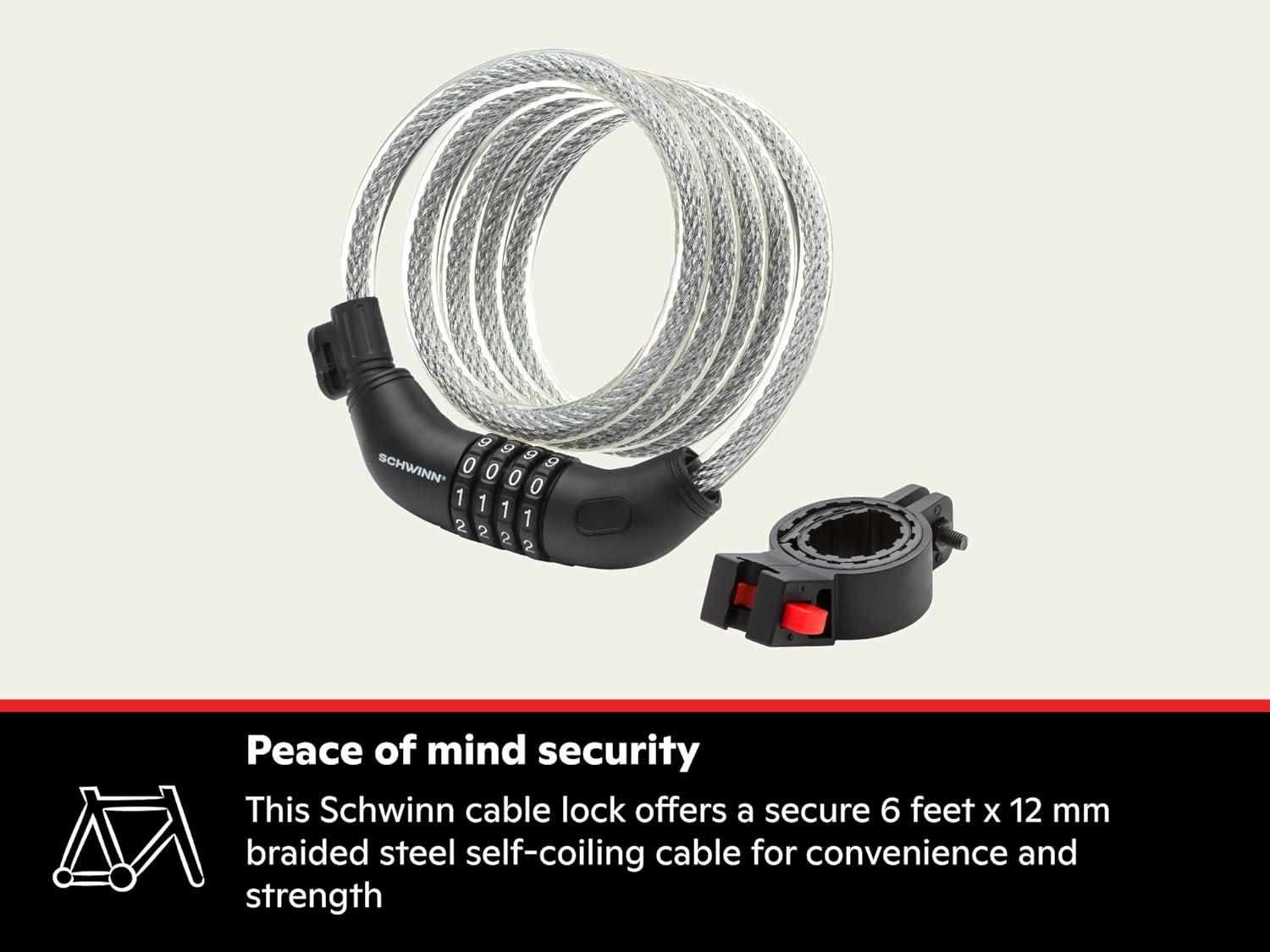 Ride with confidence knowing your bike is protected by the Schwinn 6 ft x 12 mm Combination Cable Lock. Designed for everyday riders who need reliable security, this heavy-duty lock features a 6-foot steel cable for strong, flexible protection – ideal for rural areas or short-term neighborhood parking. The durable vinyl coating helps prevent scratches on your frame and stands up to the elements for long-term use. Comes with a convenient carrying bracket for easy transportation and storage of your bike lock. With a resettable combination, you can set your lock and avoid the hassle of remembering your keys. Whether you’re locking up outside your favorite café or commuting across town, this bike cable lock has you covered.