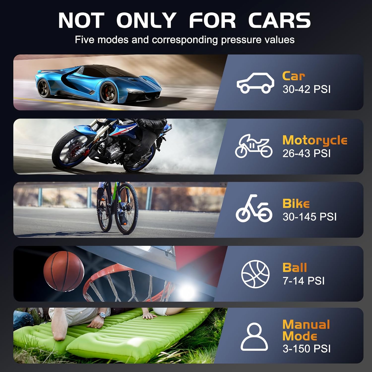 [Own More, Spend Less] With 5 preset modes for cars, motorcycles, bikes and balls, as well as a custom mode up to 160PSI, the ZUZEE portable car tire inflator is an excellent value. It is compatible with a wide range of vehicles (including SUVs, MPVs and pickups), and comes with 4 valve adapters to meet all your inflation needs. Equipped with a built-in sensor that accurately measures tire pressure in real time, the LED screen ensures you can easily view tire pressure values.
